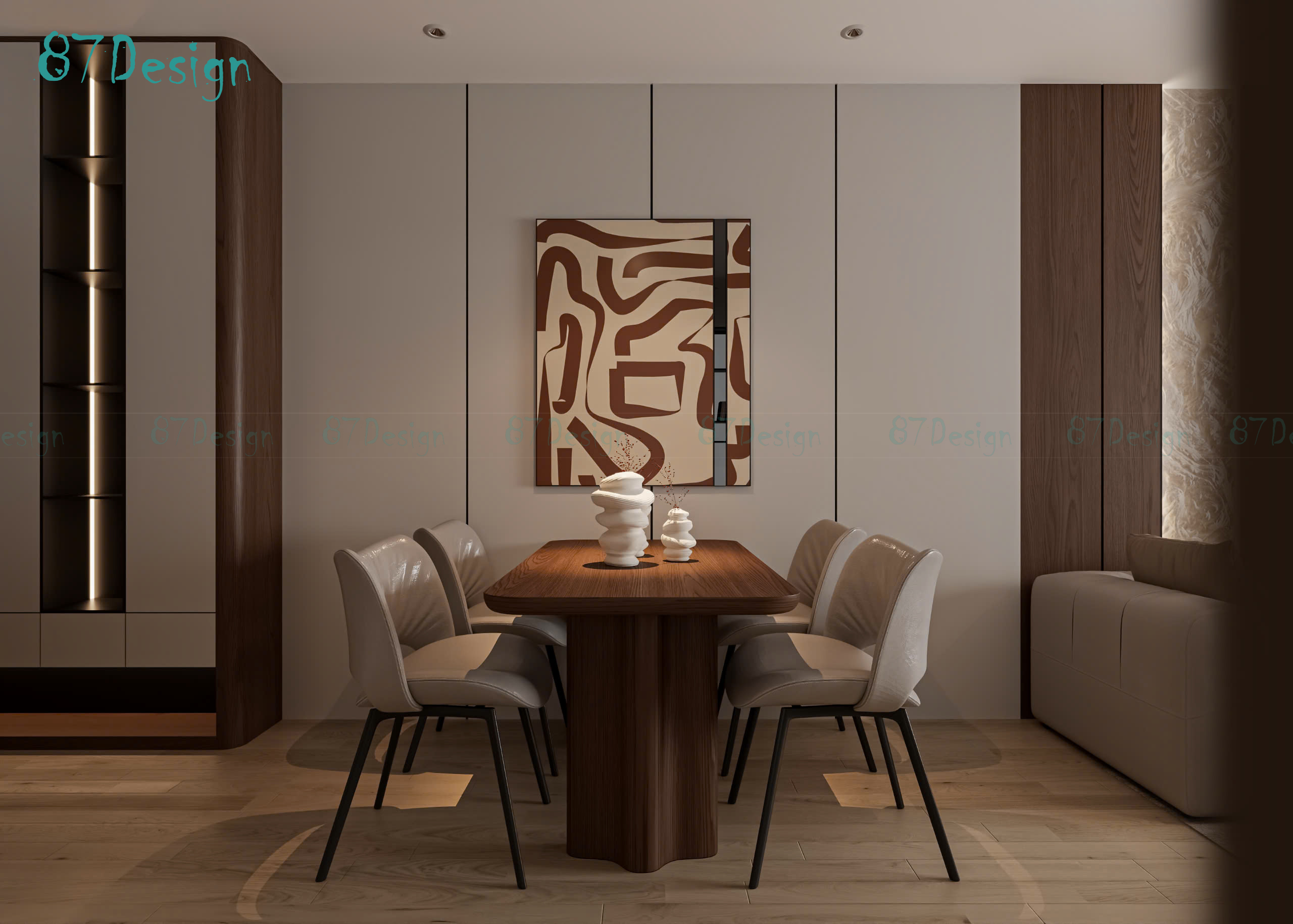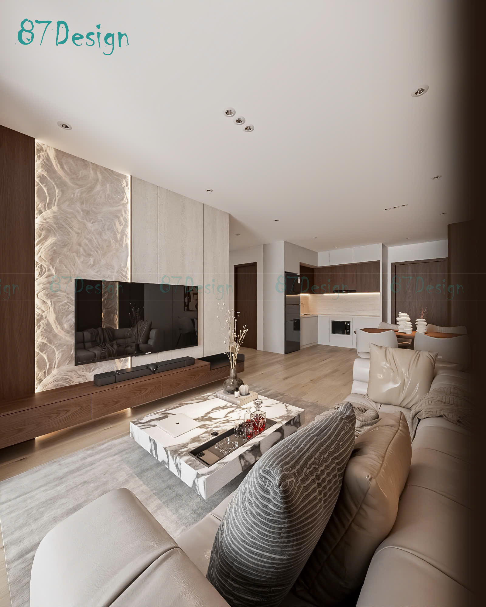Điểm nhấn đặc biệt của căn hộ nằm ở không gian mở liên thông giữa phòng khách, khu vực bếp và phòng ăn. Sự liên kết này không chỉ giúp tối đa hóa diện tích sử dụng mà còn tạo điều kiện thuận lợi cho các hoạt động sinh hoạt chung của gia đình. Bảng màu trung tính được lựa chọn một cách khéo léo, với các gam màu be, xám, trắng và nâu trầm làm chủ đạo, mang đến cảm giác ấm cúng và thư thái.
