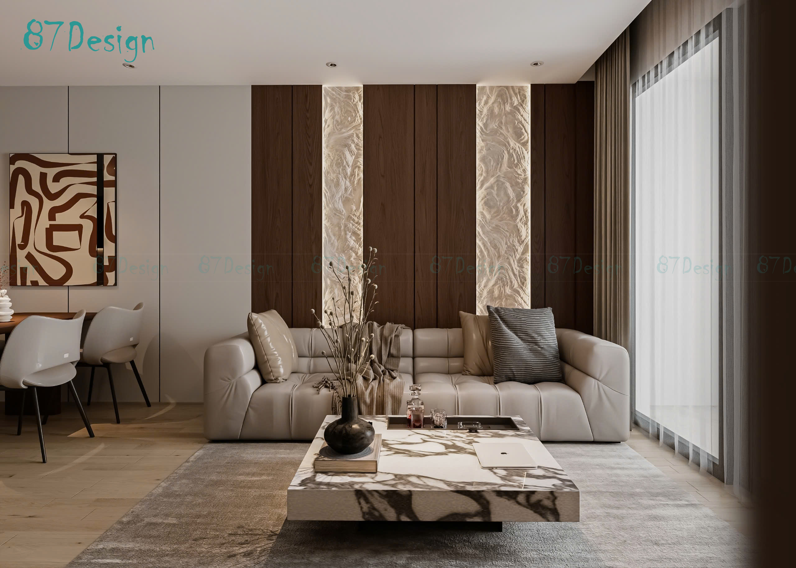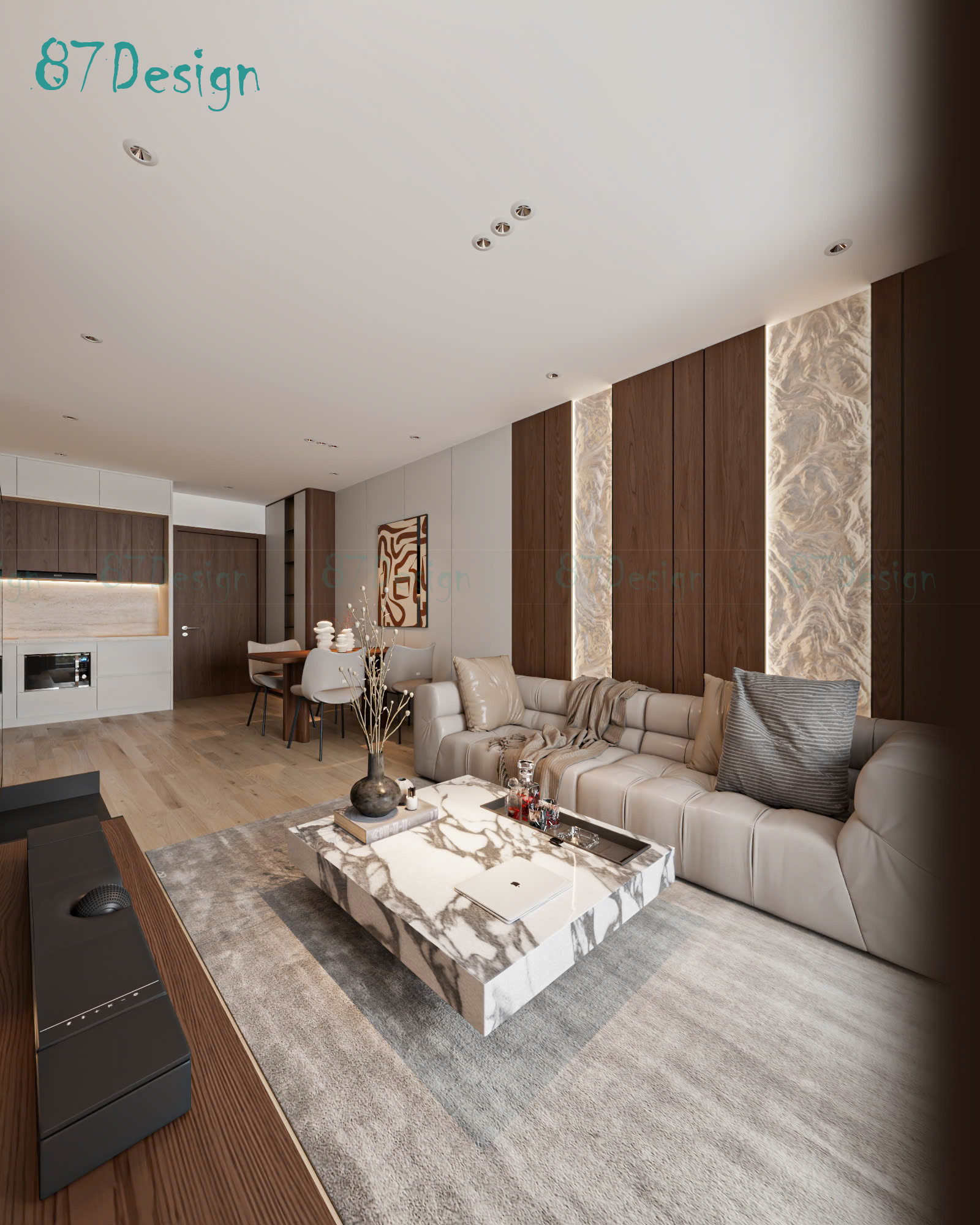 Sự sang trọng của căn hộ được thể hiện qua việc sử dụng các vật liệu cao cấp như đá tự nhiên vân mây ốp tường, gỗ công nghiệp cho tủ bếp và sàn nhà, cùng với sofa và ghế ăn bọc da mềm mại. Mỗi chi tiết đều được chăm chút tỉ mỉ, từ chiếc bàn trà mặt đá độc đáo cho đến hệ thống đèn chiếu sáng âm trần tinh tế, góp phần tạo nên một không gian sống đẳng cấp và đầy phong cách.