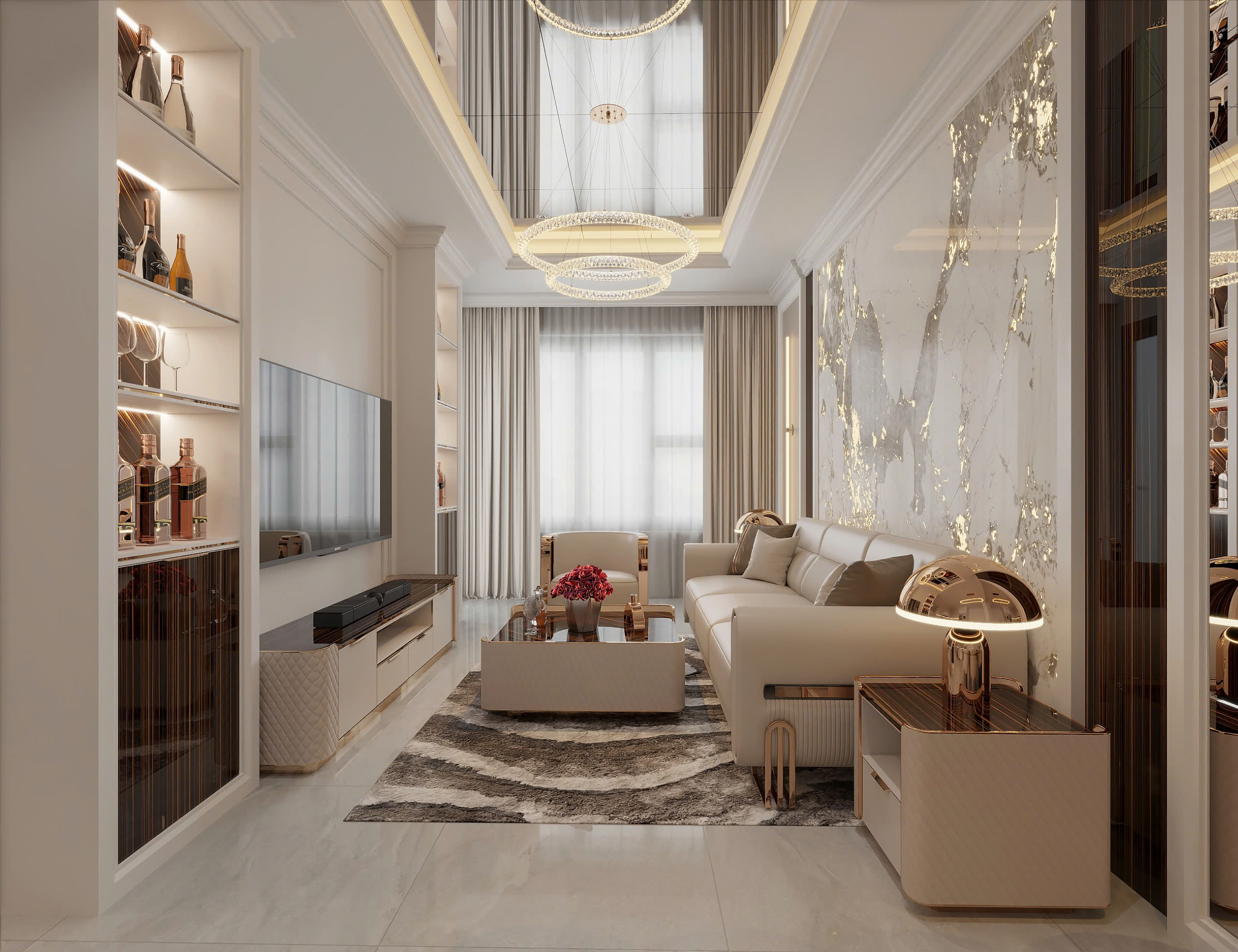 Căn hộ được thiết kế và thi công theo phong cách tân cổ điển pha lẫn hiện đại, mang đến vẻ đẹp sang trọng, tinh tế và đẳng cấp. Việc sử dụng các vật liệu cao cấp, tay nghề thi công cao và sự kết hợp hài hòa giữa các yếu tố thiết kế đã tạo nên một không gian sống lý tưởng.