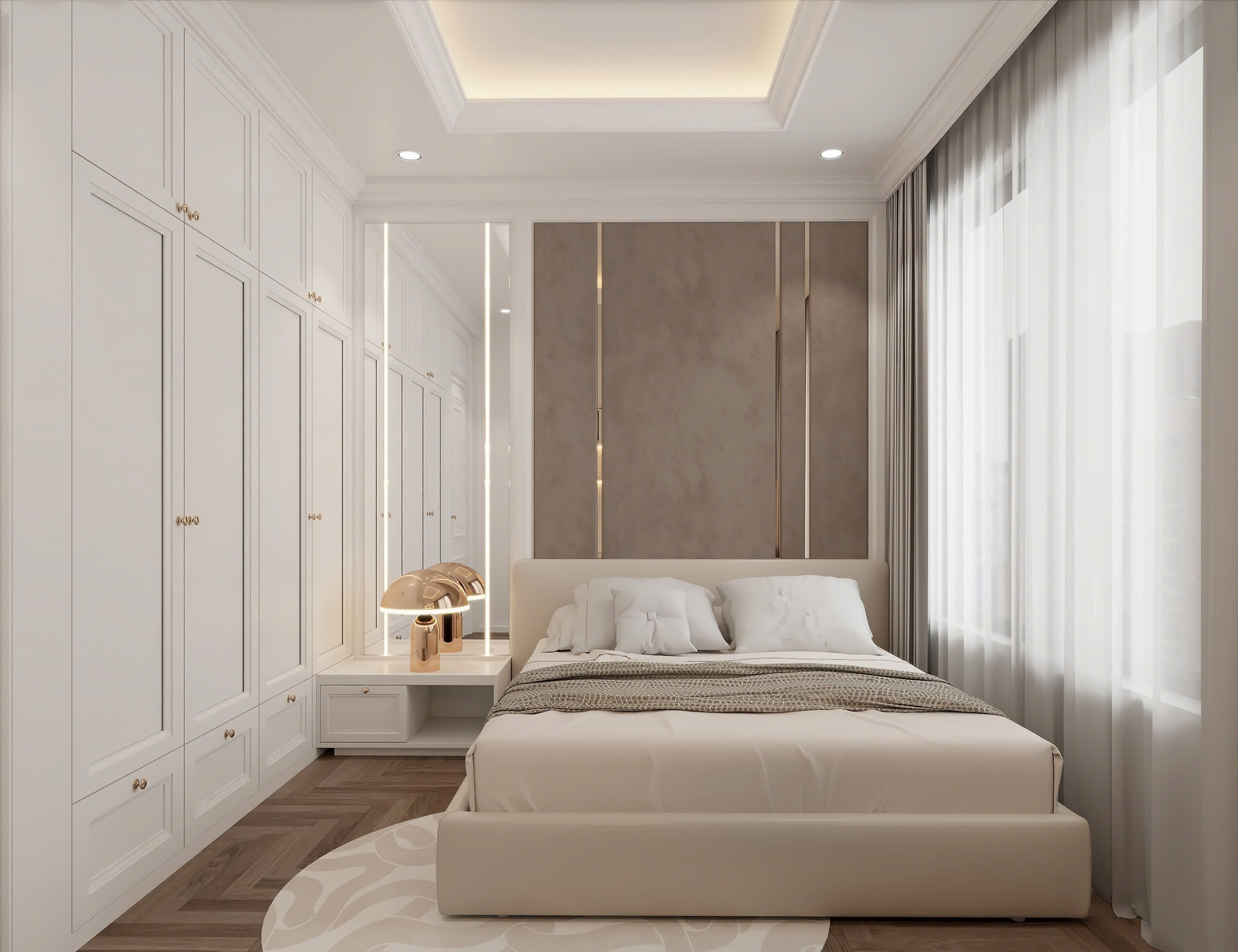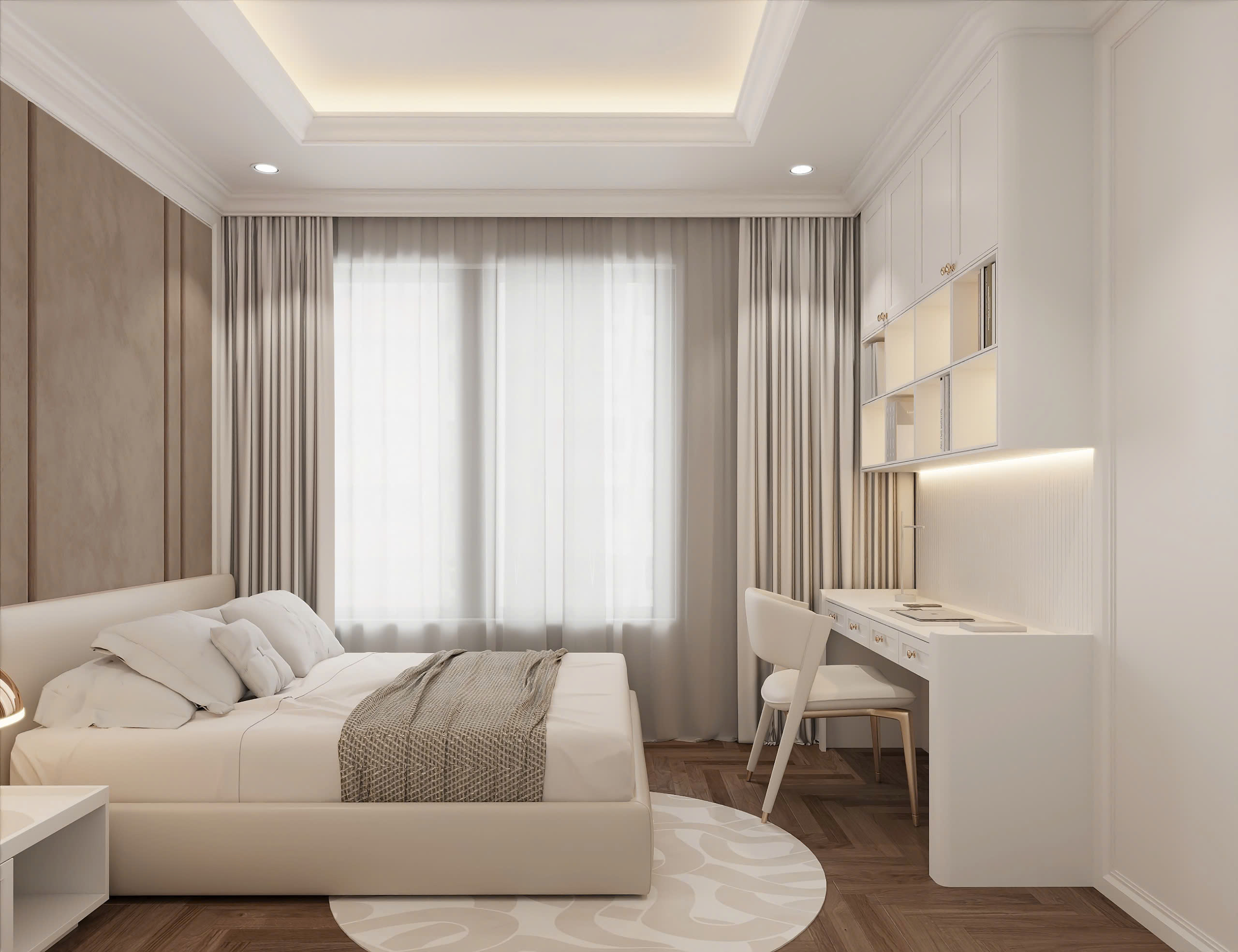 - Màu sắc chủ đạo là các gam màu trung tính như trắng, be, xám, tạo nên sự hài hòa và tinh tế.